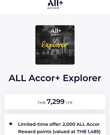 สมัคร Accor+ Explorer ตอนนี้ รับเลย 2,000 คะแนน มูลค่า 1,485 บาท คุ้มมากๆ เพราะราคาเต็มตอนนี้อยู่ที่ 7,299 บาท/ปี แต่สิทธิประโยชน์คือเกินราคามากครับ ทางไปสมัคร https://tinyurl.com/4kapcvrm