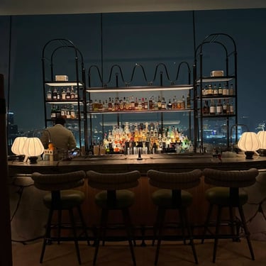 ตัวบาร์ตกแต่งสวยมาก ให้ฟีล Retro หรูๆ แบบวินเทจ พร้อมวิวกรุงเทพยามค่ำคืนที่มองออกไปได้เต็มตา 🌃
