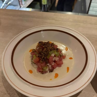 • 🐟 Atún y Ajo Blanco (680++) — Bluefin tuna crudo ที่โดดเด่นสุดๆ เนื้อปลานุ่มละมุน เสริมด้วย iberico crumble เพิ่ม texture กรุบกรอบ เคี้ยวเพลินมาก จานนี้ “Must order”