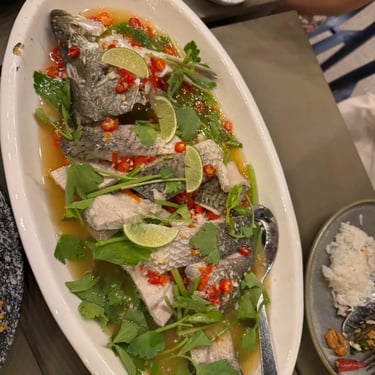 • ปลากะพงนึ่งมะนาว (495 บาท) – ปลาตัวใหญ่ สด น้ำราดเปรี้ยวจัดจ้านแบบไทยแท้
